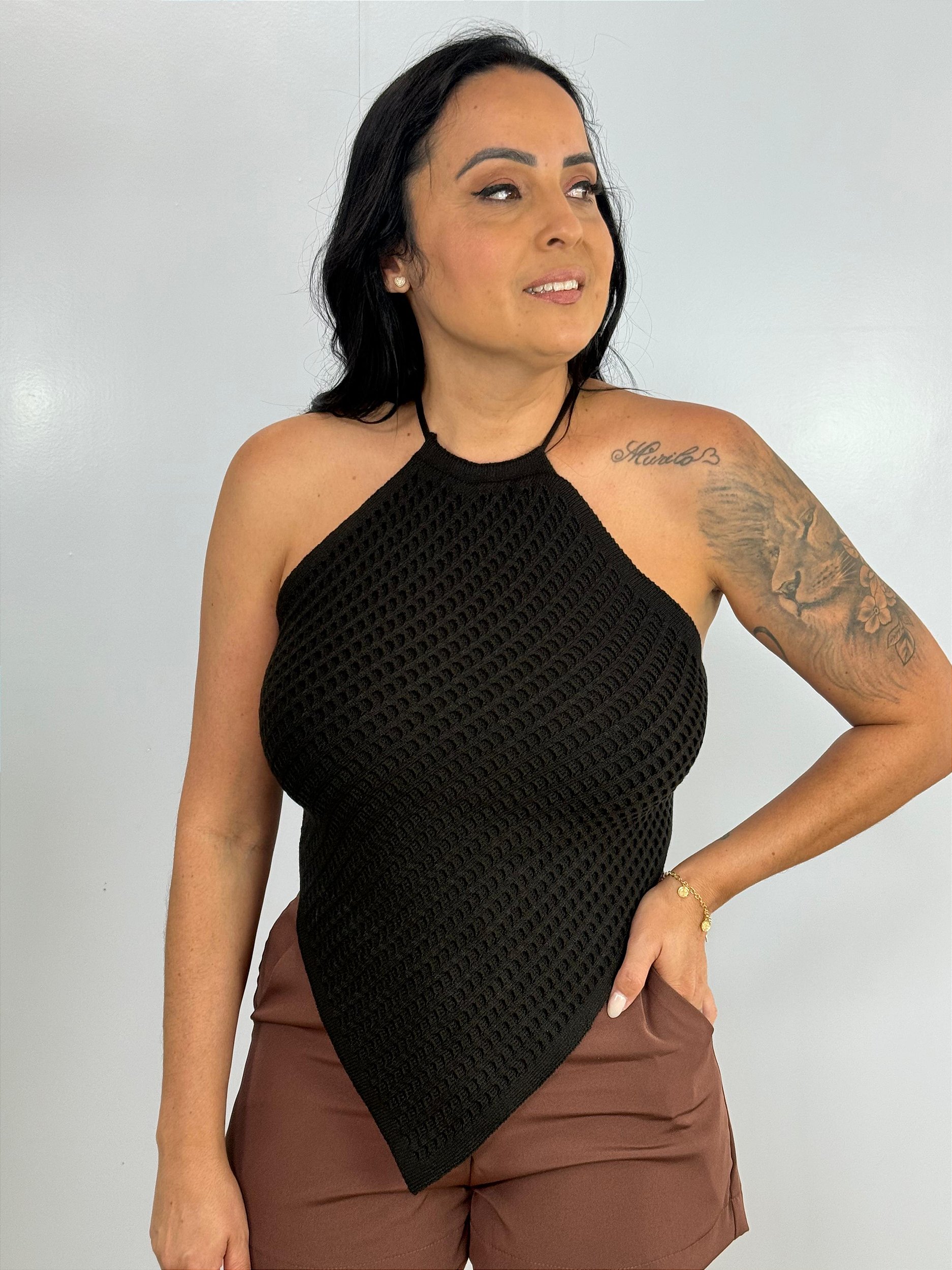 Feita em tricot leve e macio, veste super bem e se adapta ao corpo com um caimento impecável. O toque delicado do tecido traz charme e elegância, enquanto o design ousado nas costas garante presença onde você passar!