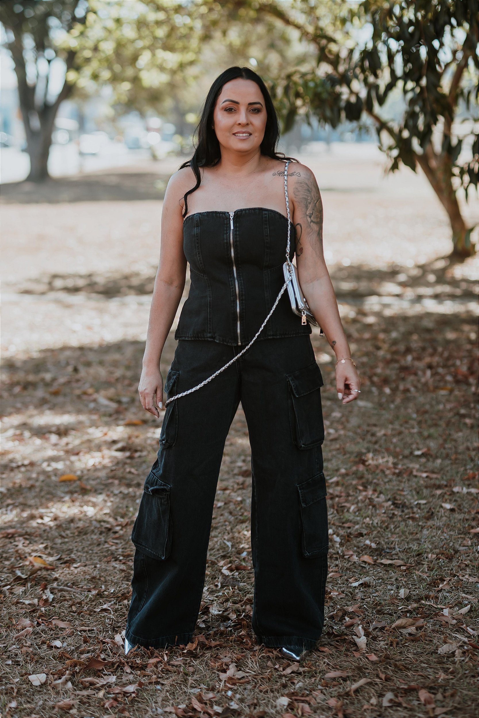 đ Calça cargo jeans estonada preta, com bolsos utilitĂĄrios, cintura alta e modelagem perfeita.