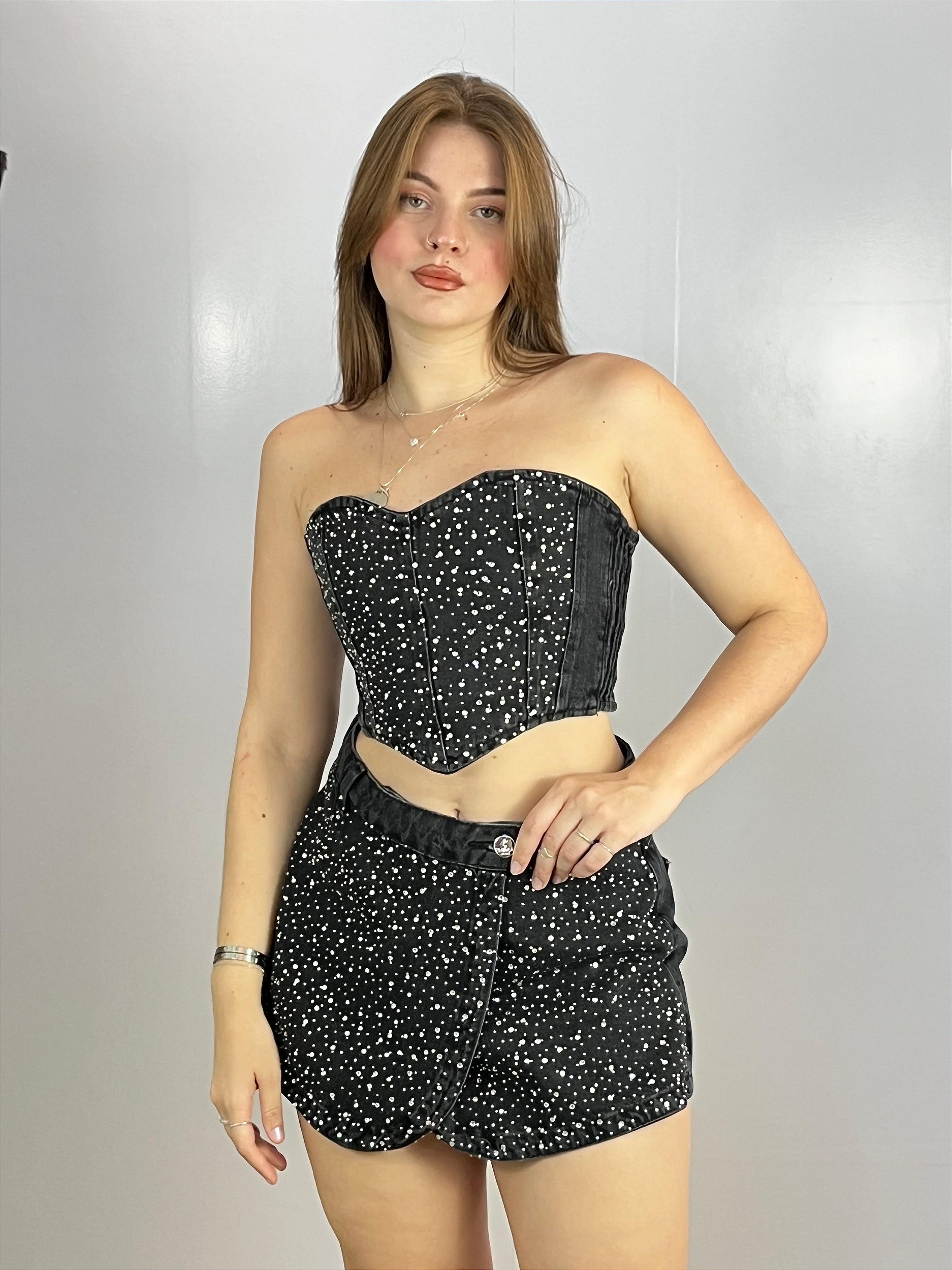 Nome: Conjunto Cropped Tomara que Caia + Short Saia com Strass