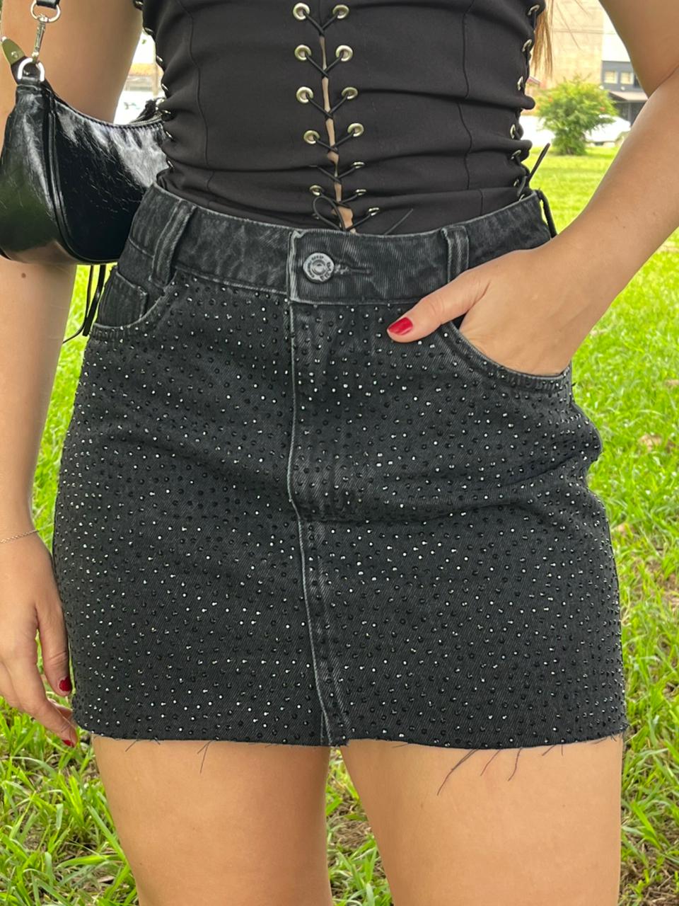 Garanta jĂĄ sua Saia Preta Brilho com Strass e arrase por onde passar! âš